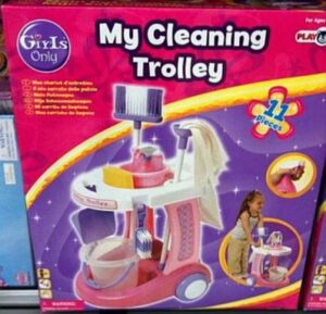 Once piezas entre las que se incluyen varios cubos, una fregona, una escoba, un estropajo y un recogedor era el maravilloso juguete pensado exclusivamente para niñas. Por si no quedaba claro al ilustrarlo con la fotografía de una niña tirando de él, en la esquina superior izquierda podía leerse Girls Only.
